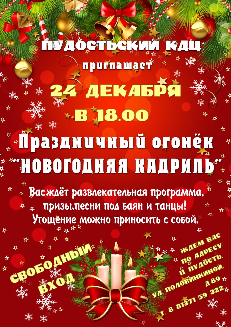 24 декабря приглашаем на праздничный огонёк «НОВОГОДНЯЯ КАДРИЛЬ» Опубликовано 12.12.2019 в рубрике Афиша, Новости